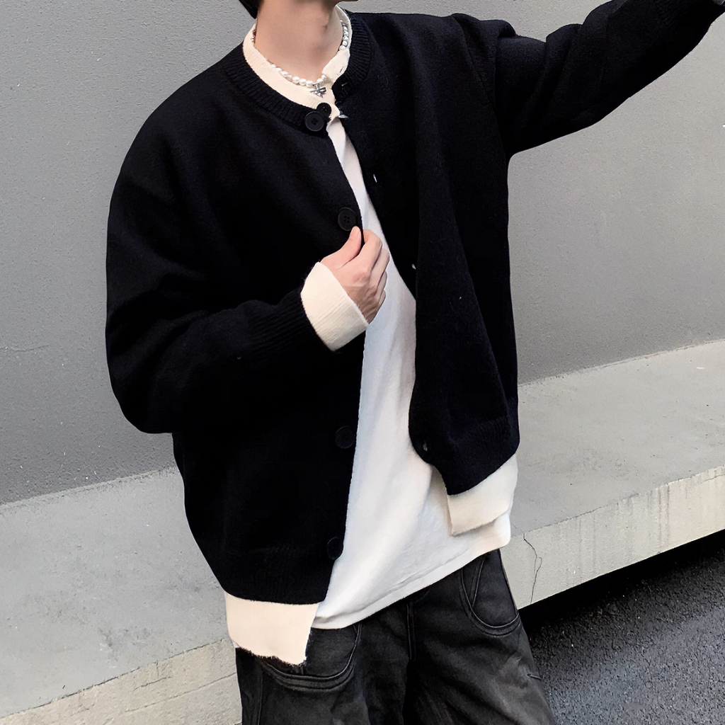バイカラーの配色がアクセントのカーディガン。